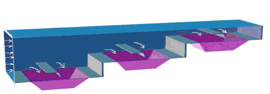 在設(shè)計過程中,我們尤為強調(diào)分段化和組合化設(shè)計,結(jié)合以往大量類似工程的設(shè)計和運行經(jīng)驗,分析出本工程與其它工程的異同點。在場地允許條件下,我們將采用模塊組合式方法,即依據(jù)風量大小來調(diào)整倉室的數(shù)量,盡量使倉室排布形式與已運行設(shè)備的倉室排布形式相同,在減少設(shè)計和試驗工作量的同時,還可以_設(shè)計完善可靠。而進出風總管_要依據(jù)風量、粉塵濃度進行分段化設(shè)計。對于粉塵濃度大的工況,我們傾向采用楔形通道;而對于粉塵濃度小的工況,我們傾向采用階梯形通道。