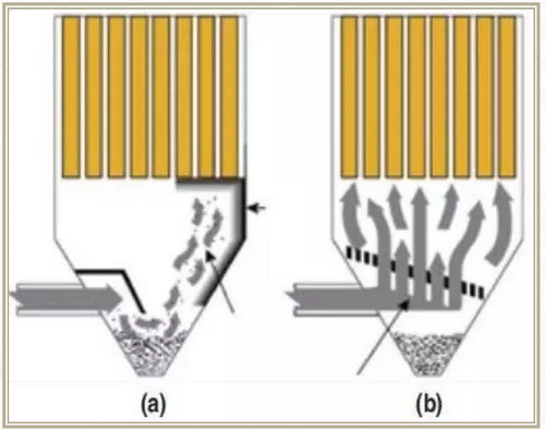 進(jìn)入料斗底部區(qū)域的氣流可能導(dǎo)致料斗中的顆粒向上旋轉(zhuǎn)并重新夾帶在過濾介質(zhì)中。當(dāng)與進(jìn)料結(jié)合時(shí),從料斗重新攜帶的物料在濾袋上產(chǎn)生_的顆粒負(fù)載。如果進(jìn)料直接通過狹窄的料斗,則與進(jìn)料口相對(duì)的側(cè)壁上可能發(fā)生過度的磨損。