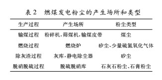 在輸煤過(guò)程和燃燒過(guò)程會(huì)產(chǎn)生大量的煙氣粉塵,燃煤電廠生產(chǎn)過(guò)程中也會(huì)產(chǎn)生很多粉塵,主要有煤塵、石灰石粉塵、石膏粉塵及矽塵等。在一般生產(chǎn)過(guò)程中粉塵的產(chǎn)生場(chǎng)所和粉塵類型見(jiàn)表2。
