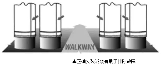 應(yīng)檢查折疊在支撐籠頂部的帶法蘭或袖口的布袋邊緣是否平滑,以防止泄漏和布袋磨損。底部裝載袋上的接縫應(yīng)與籠圈上的裂縫或間隙成180°。這些布袋上的夾子應(yīng)該相對于布袋上的接縫安裝90°,并且位于袋籠的凹槽中。頂部進(jìn)入脈沖噴射裝置的卡扣袋應(yīng)安裝在接縫全部朝向相同的方向。這樣可以識別發(fā)生問題的區(qū)域,并_設(shè)備的故障排除。